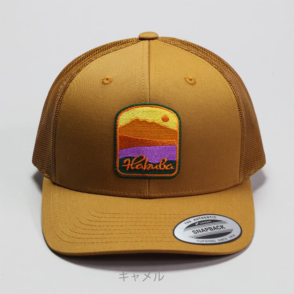 白馬村のシンボル「白馬三山」をモチーフにしたワッペン付きのメッシュキャップ。スナップバックでサイズ調節も簡単です。