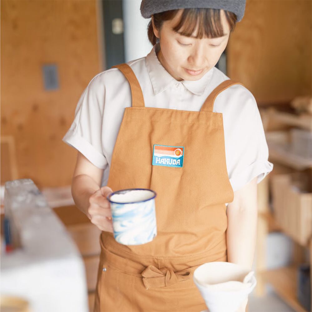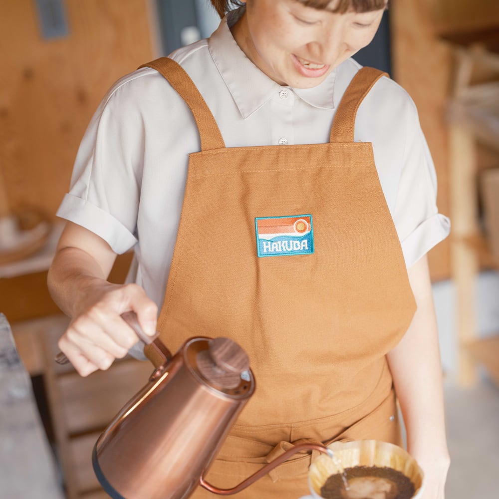 タフな生地で長く使え実用性をそなえたワークエプロン。仕事内容やそれぞれのファッションのスタイルに合わせられるように、シンプルだけど、インパクトのある白馬の自然をイメージしたデザインのワッペン付き。かがみやすいように入れられたセンタースリットや、ペン差し付きのポケットなど便利なデザインもポイント。